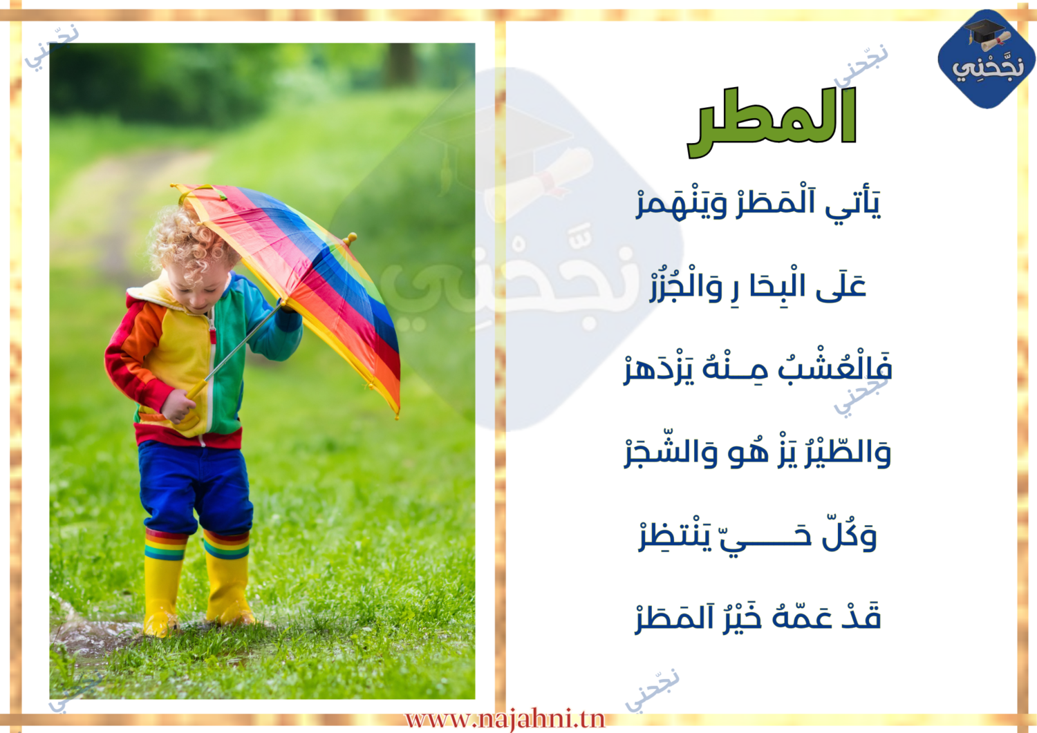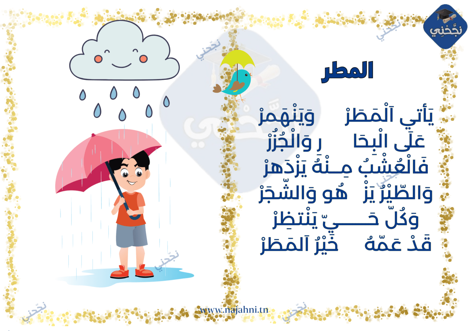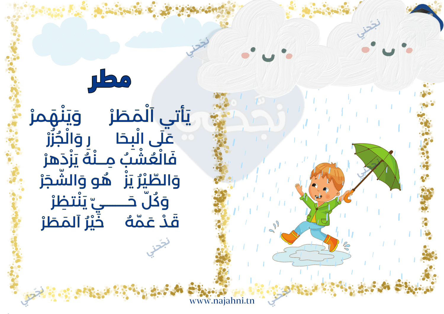يقدم لكم الموقع التربوي نجحني محفوظات مطر للسنة الأولى من التعليم الابتدائي. يمكنكم تحميل المحفوظة في صيغة صورة أو ملف بي دي افpdf قابلة للطباعة.