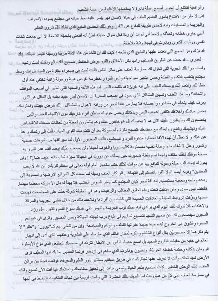 ابتسم خالد وقال: “أعتقد أن كلامك صحيح، لكن تحتاج إلى جهد جماعي التغيير أن يأتي من جهة واحدة فقط يجب أن يتكاتف الجميع الأسرة المدرسة والمجتمع بأرم” أجبته: “هذا ما قوله بالضبط التغير ا يخطوا ، مثل الحوار مع الشباب والاستماع إليهم بصدق، لكنه يحتاج أيضا إلى استراتيجية شاملة على مستوى المجتمع باكمله ” في نهاية حديثنا شعرت أنا وخالد باننا قد قطعنا خطوة صغير التفكير الجاد في هذه القضية. كان الحوار فرصة لتبادل الأفكار وإيجاد حلول عملية وعدنا بأن تحاول كل من جهته أن يساهم في التوعية بهذه القضية الخطيرة، لأن حماية الشباب هي حماية للمستقبل بأكمله.