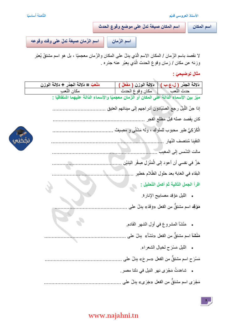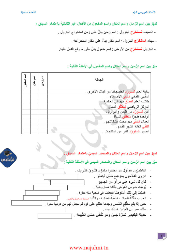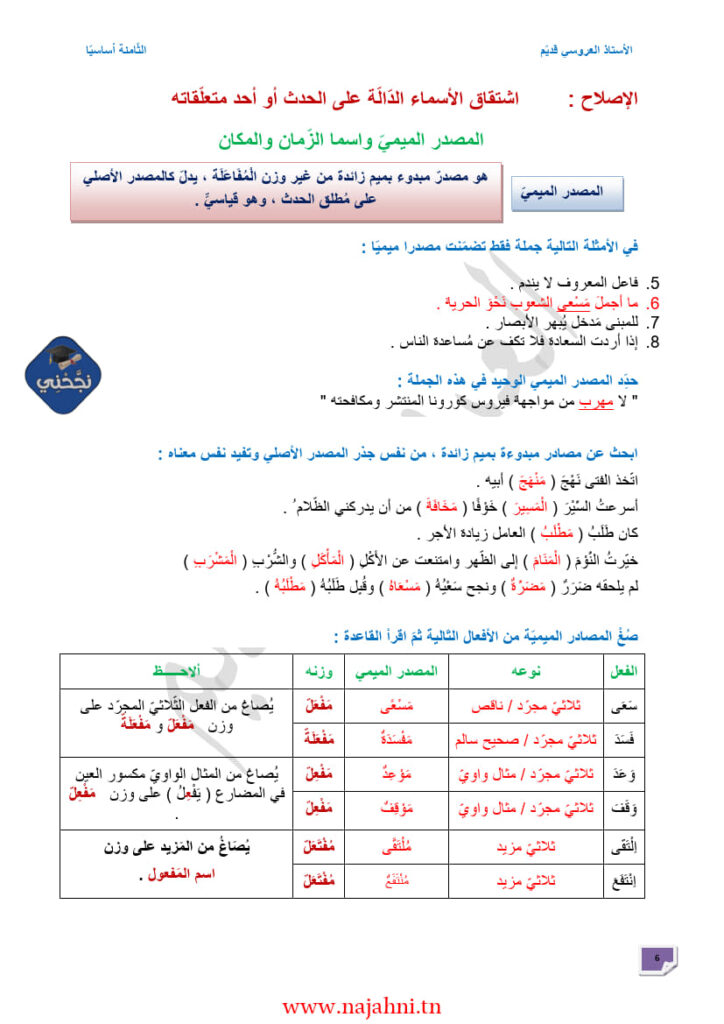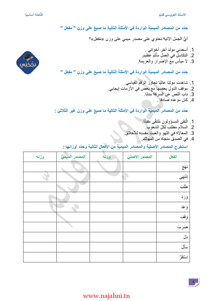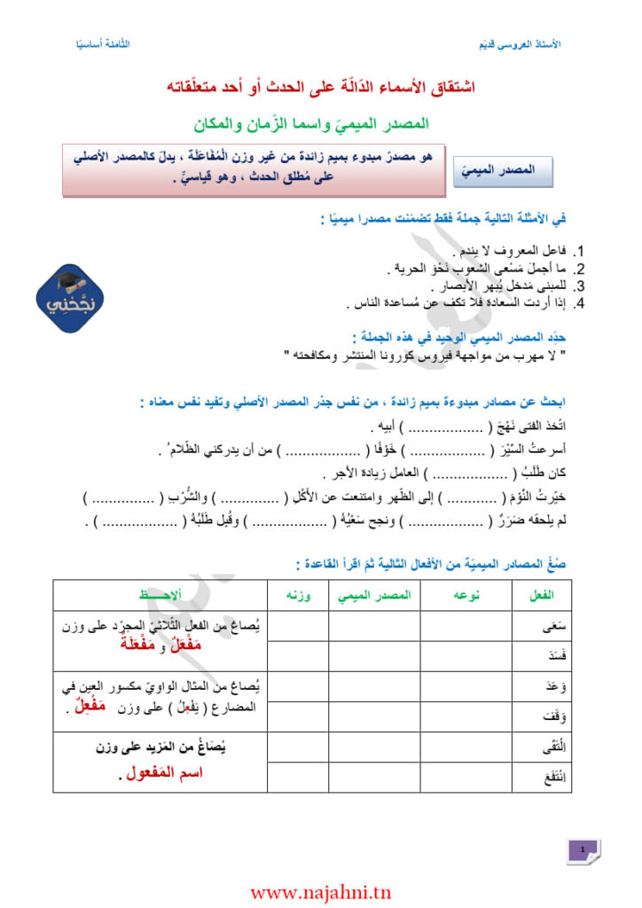 مجموعة تمارين للسنة الثامنة اساسي : المصدر الميمي واسم المكان واسم الزّمان من دروس العربية، شكرا لصاحب العمل سي لعروسي قديم .يمكنكم تحميل الملف بصيغة pdf من الموقع التربوي نجحني. رابط التحميل في الاسفل بصيغة pdf.