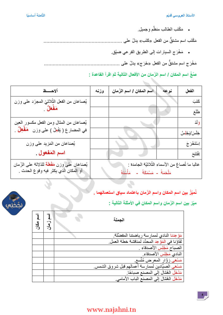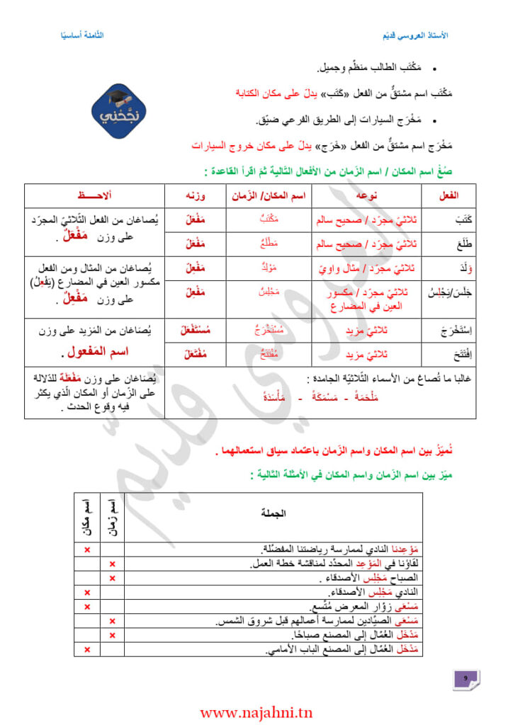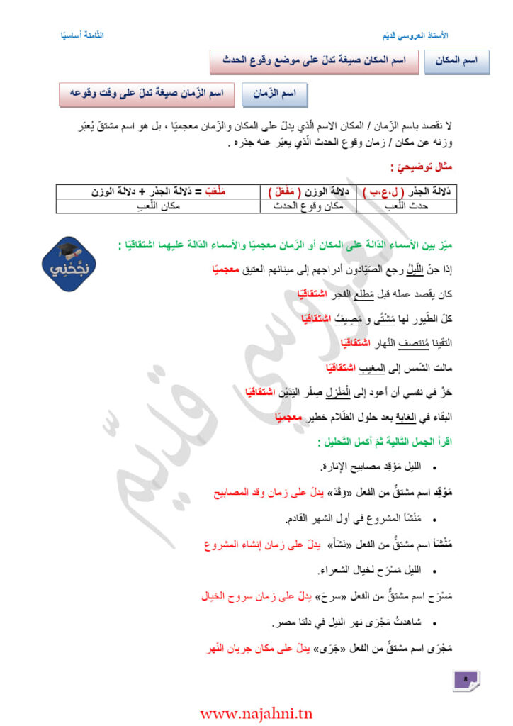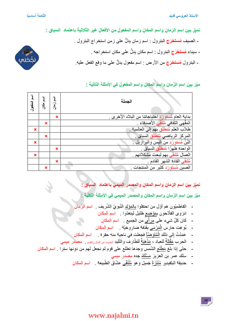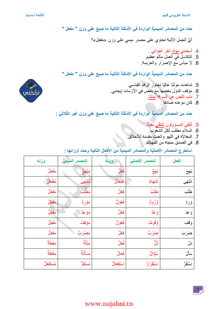 مجموعة تمارين للسنة الثامنة اساسي : المصدر الميمي واسم المكان واسم الزّمان من دروس العربية، شكرا لصاحب العمل سي لعروسي قديم .يمكنكم تحميل الملف بصيغة pdf من الموقع التربوي نجحني. رابط التحميل في الاسفل بصيغة pdf.