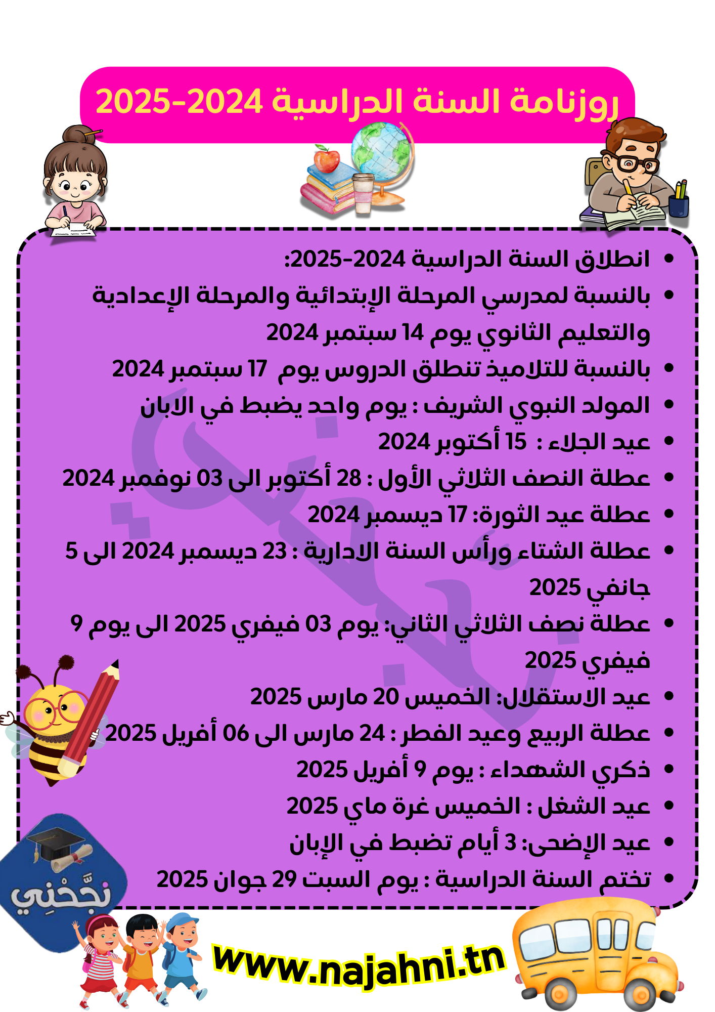 نستعرض لكم مواعيد بداية وانتهاء السنة الدراسية وروزنامة العطل المدرسية 2024-2025 حسب المنشور الصادر عن وزارة التربية التونسية.