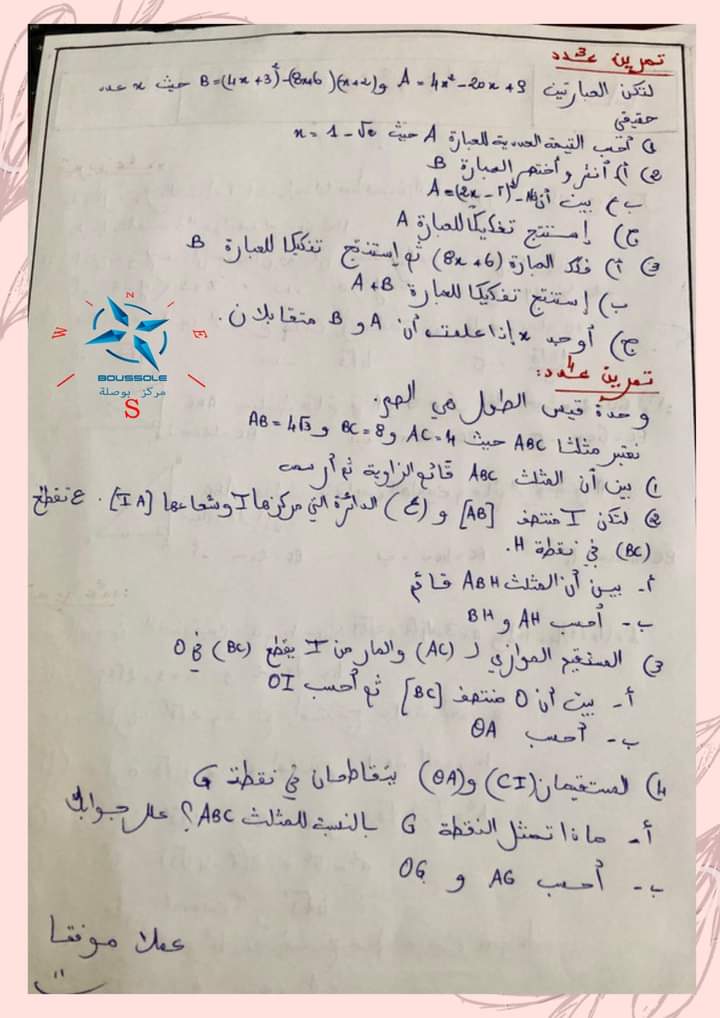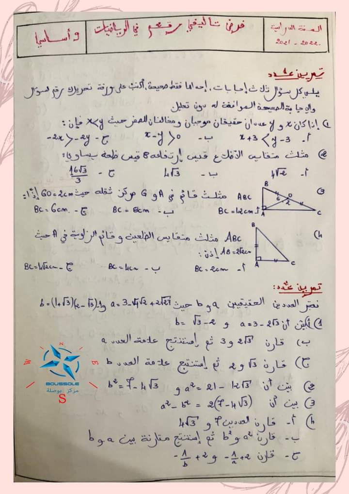 فرض تأليفي عدد 2 سنة تاسعة في الرياضيات مع الإصلاح.