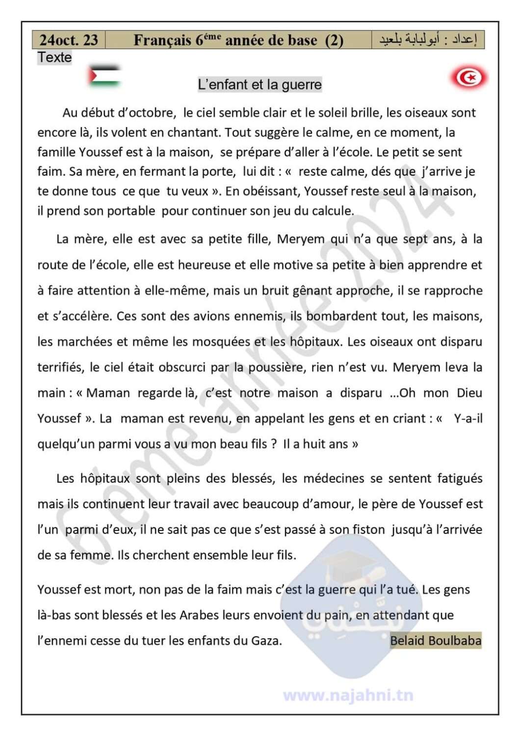 devoir lecture compréhension :l’enfant et la guerre 6eme année